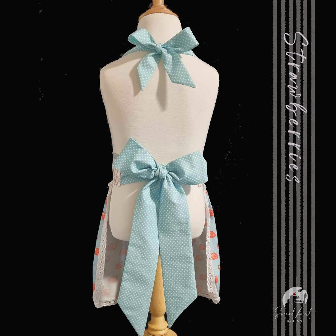 Featured here is a delightful child's apron with an open back design, hand painted strawberries on a soft blue dotted background, perfect for children aged 4 to 8. This apron includes generous ties and is embellished with a white frilled pocket on both the bib and the skirt.