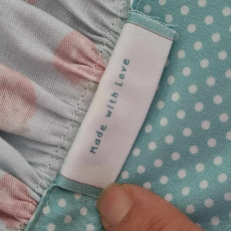 All artwork on the bib, waste band and skirt are my original hand-painted designs, printed in Australia on 100% Organic Cotton fabric in a sateen weave that offers a subtle sheen.